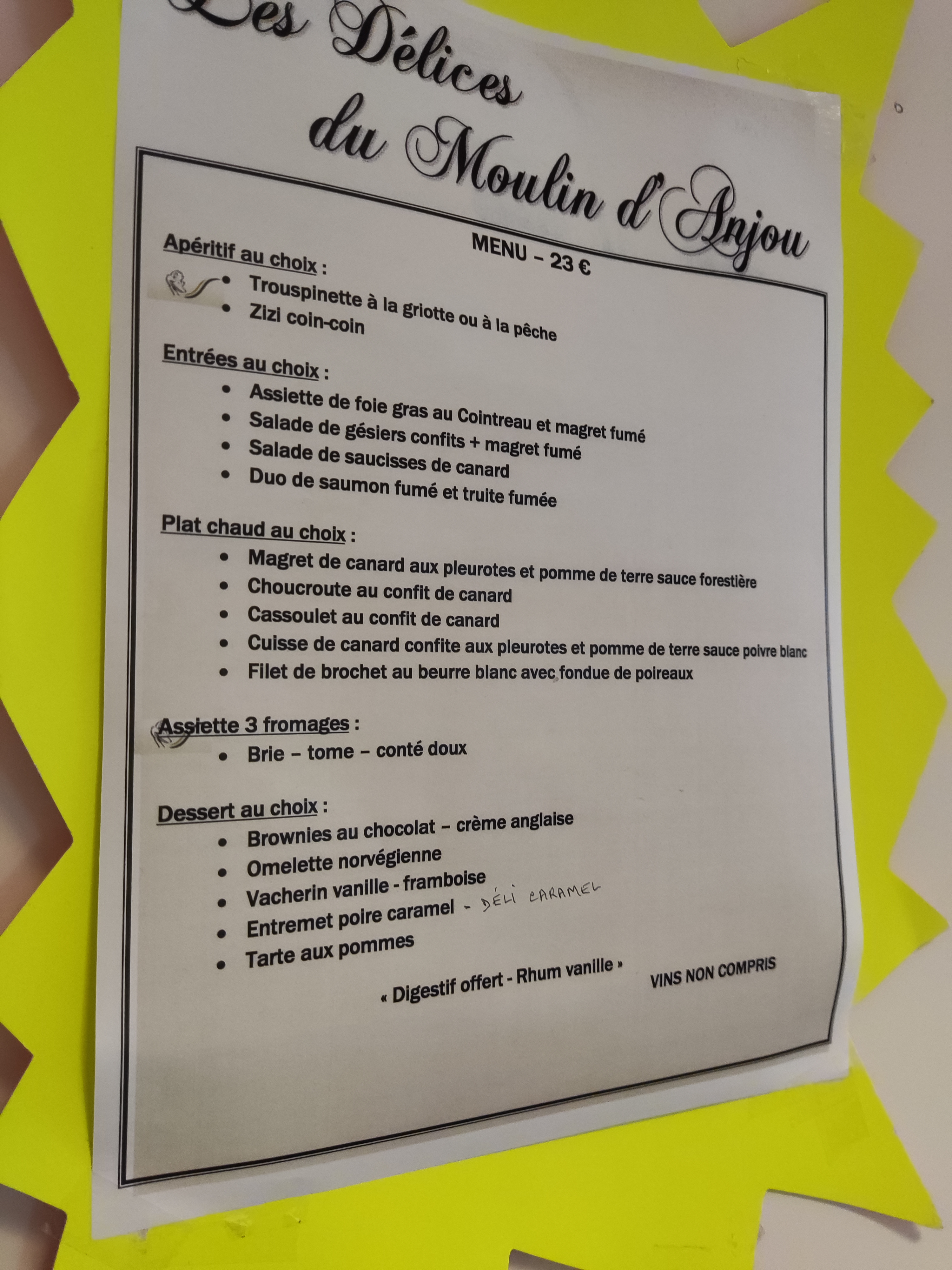 C'est le mois d'août, il fait beau, il fait très chaud, il fait SOIF ! Voilà un cadre merveilleux, je m'arrête, et l'accueil là aussi est merveilleux !!! Que la bière est bonne avec une vue directe sur un parc resplendissant !!! Bravo la Ville du Louroux. Puis j'ai faim, et je décide de rester manger. Un délice!!! Le menu est complet et pas cher! Devant visiter ma future propriété presque tous les jours, alors les midis, je viens me régaler et relaxer aux délices du moulin d'Anjou. J'apprends aussi à connaître la région en discutant avec tout le monde. Je me sens chez moi, je me sens bien encore une fois, dans ce commerce du Louroux Béconnais. Stationnement facile, je vais revenir vous voir et me régaler comme cet été. Merci et joyeuses fêtes de fin d'année !